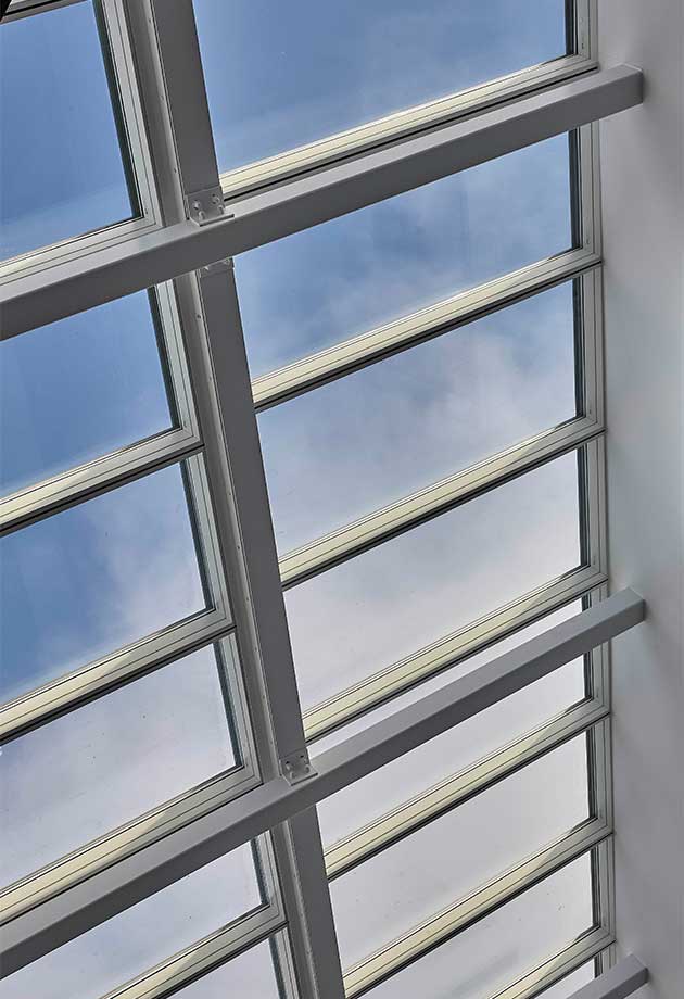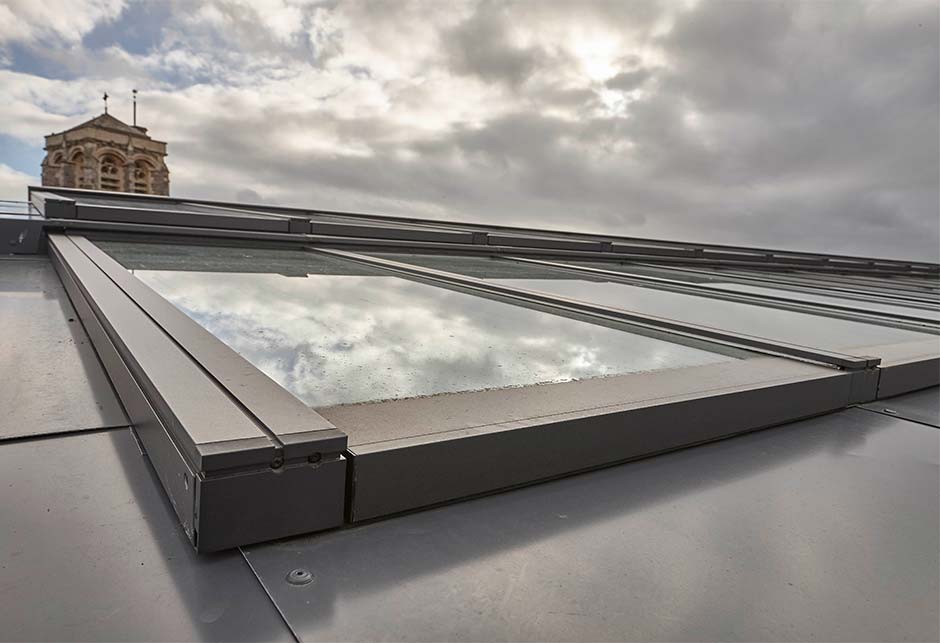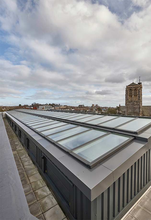 At Exeter College in Devon, UK, modular skylights have been installed above an existing steel infrastructure as part of an extension project that connects old and new buildings. Elegant, slim beam skylights and steal pillars mirror one another in length, creating an awe-inspiring design aesthetic that is not only eye-catching, but considerate of building owners’ safety requirements. Roof access for future maintenance played a central role in design planning, as did the need for the skylights to be elevated in a manner that maximizes daylight exposure, across multifunctional college spaces.