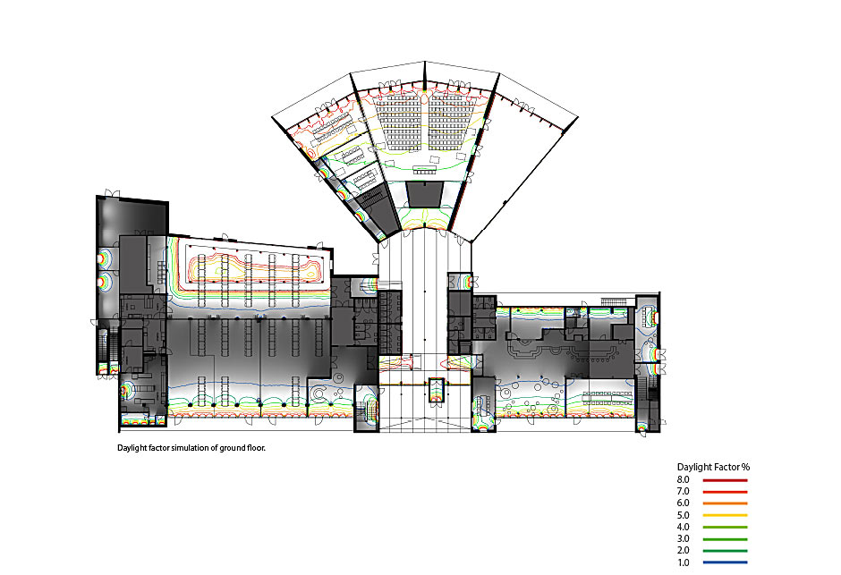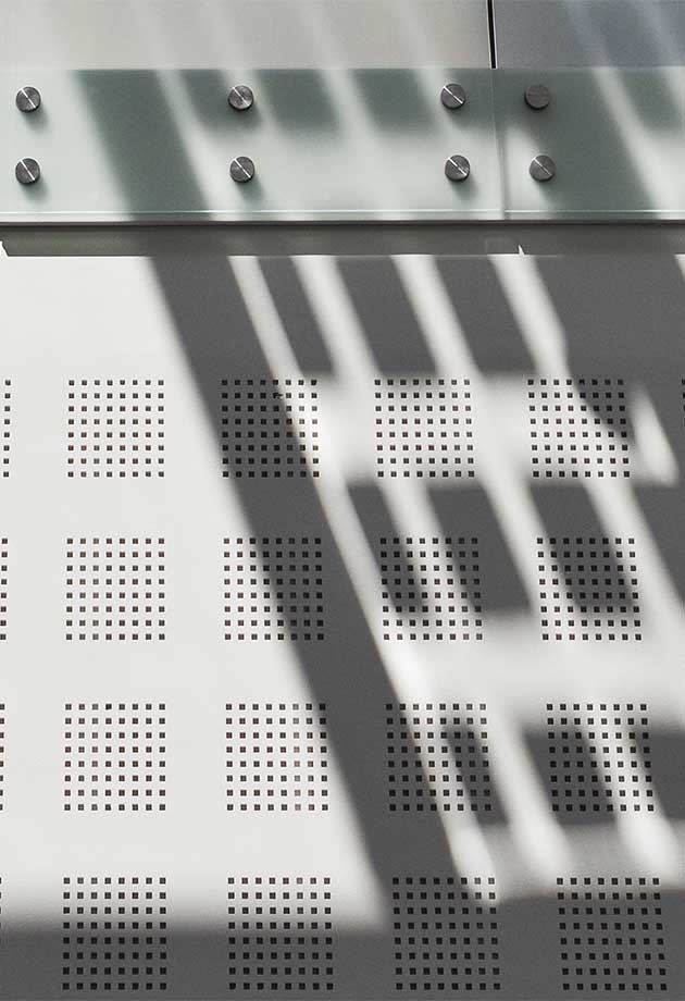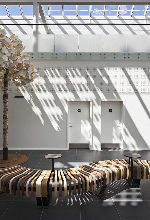 - 196 moduler med rytterlys 25–40° gir store mengder naturlig dagslys til den innvendige terrassen.