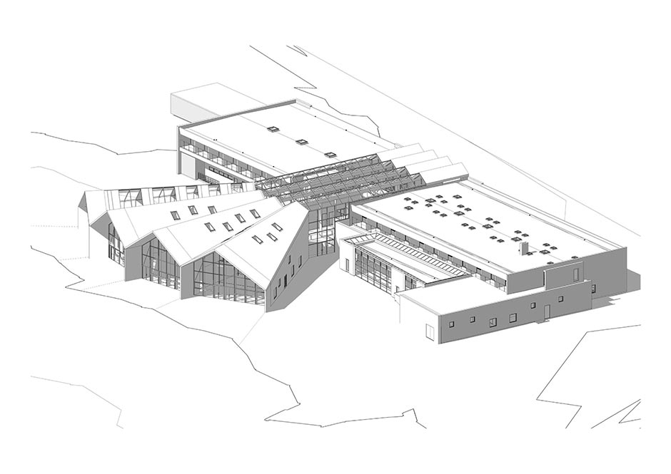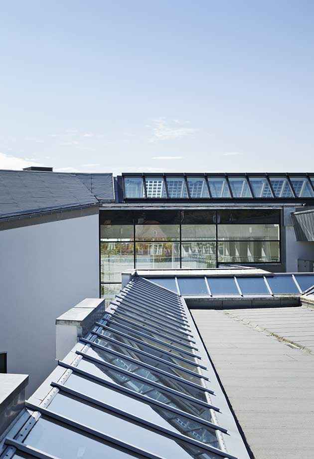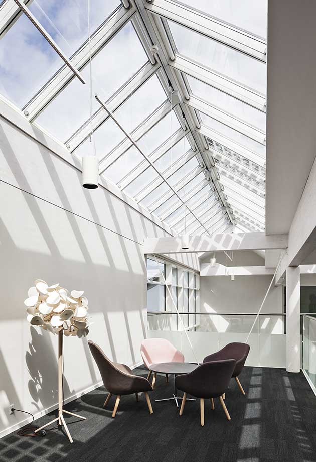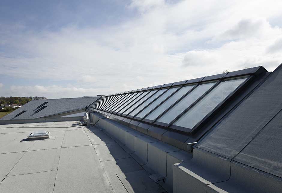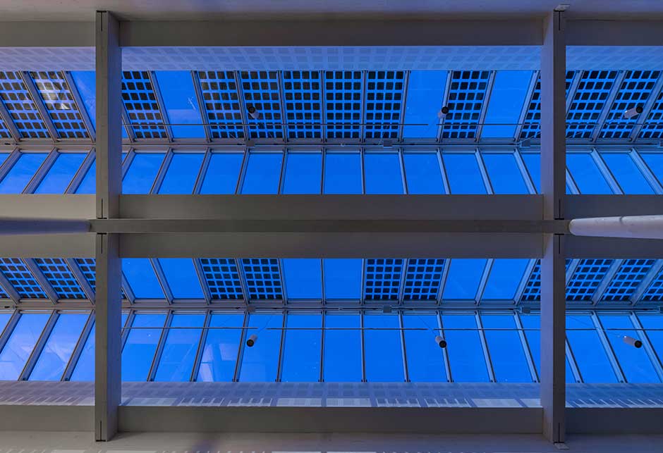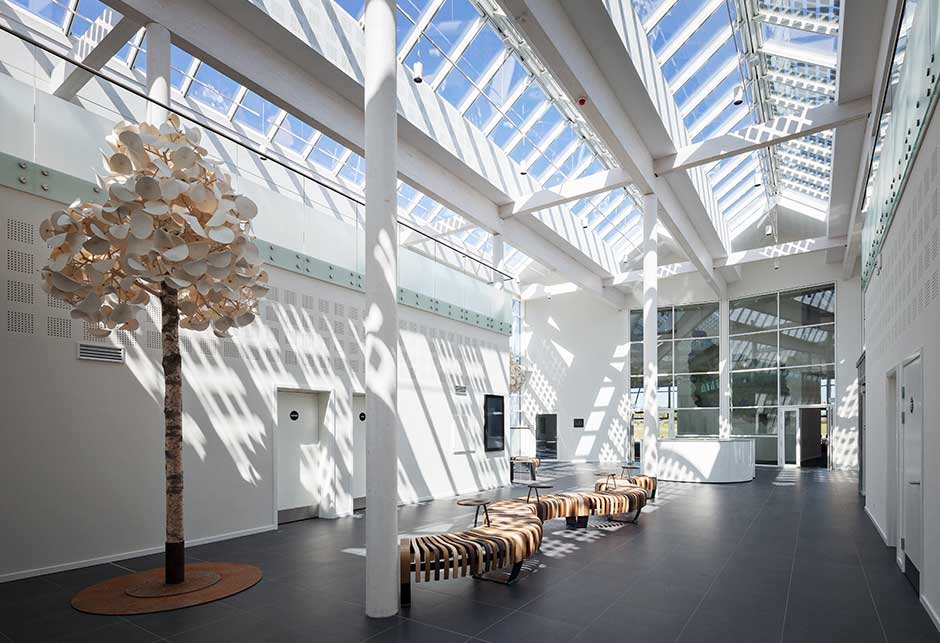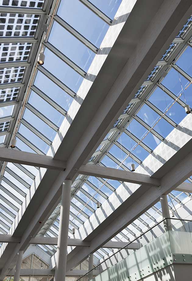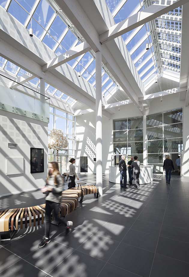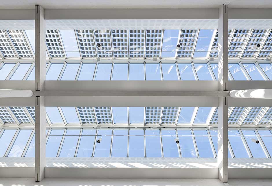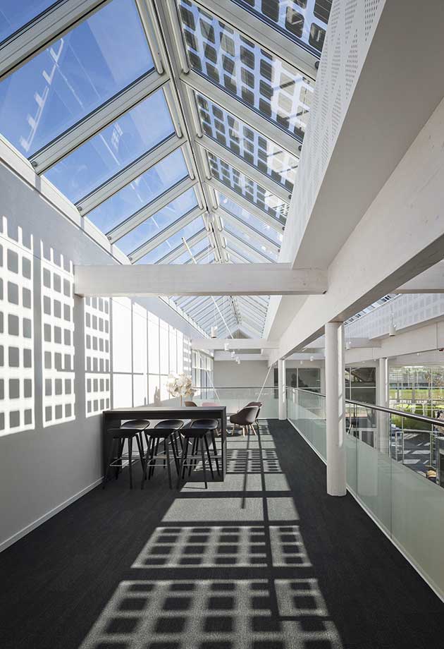 - En tredjedel av overlysmodulene er utstyrt med integrerte solceller for å styrke bygningens grønne profil.