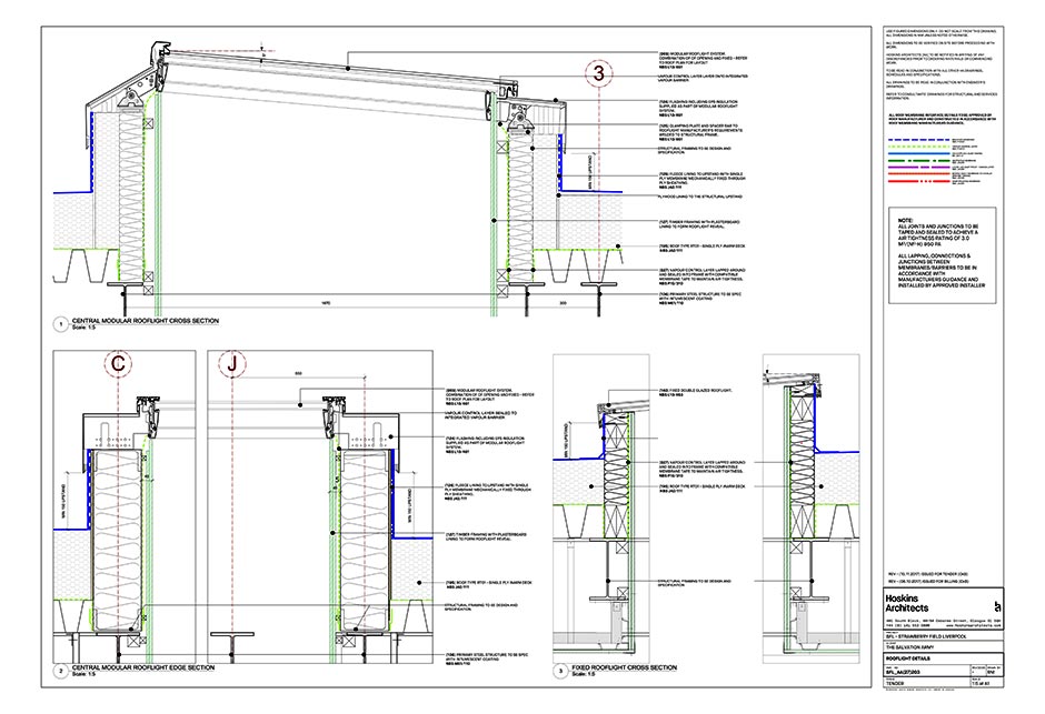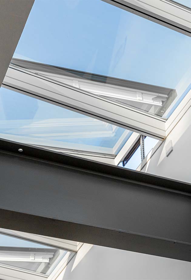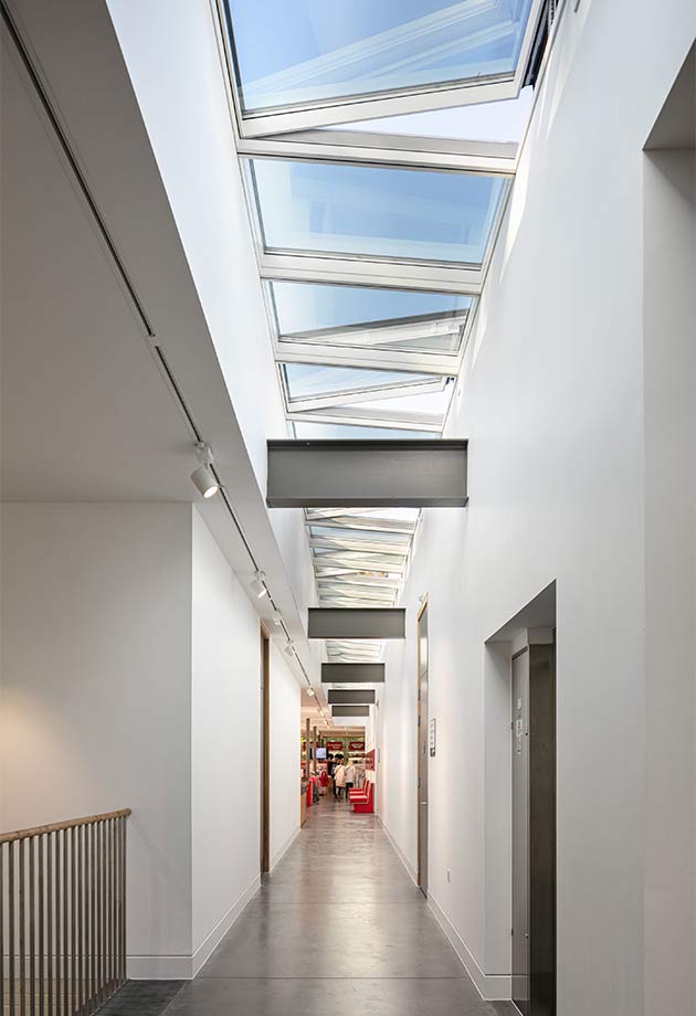 - The VELUX Longlights, each measuring 900mm x 1400mm, create a central “spine” running the entire length of the building, bathing the spaces below with natural daylight and giving beautiful sky views
