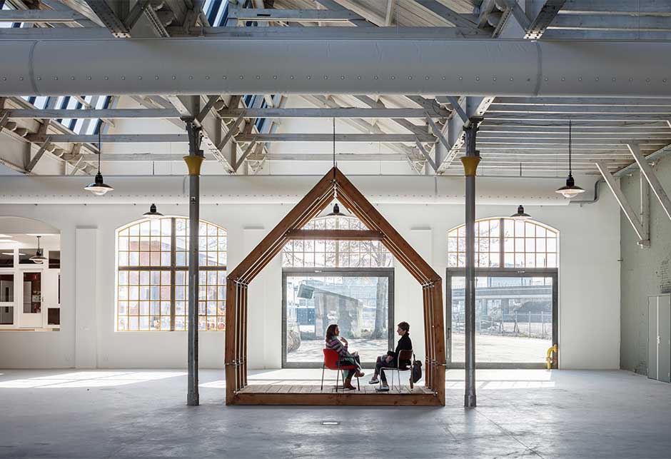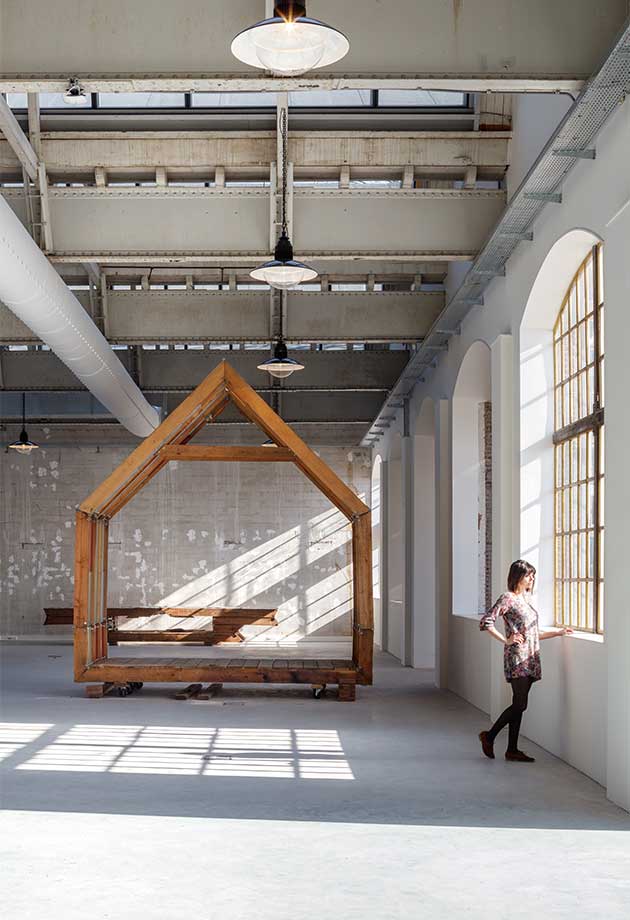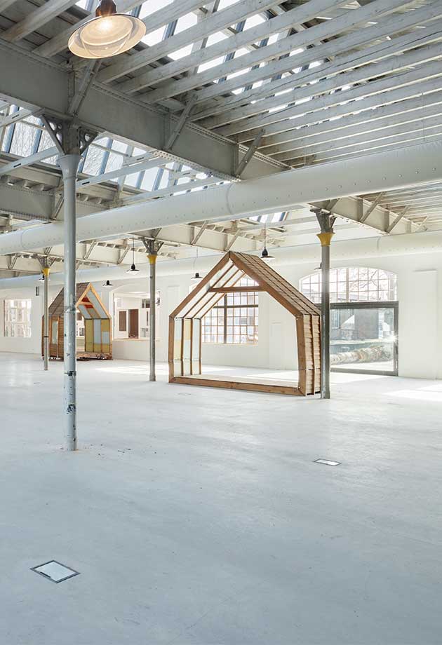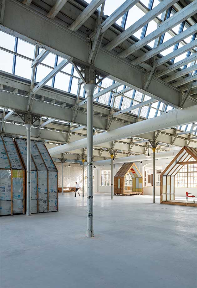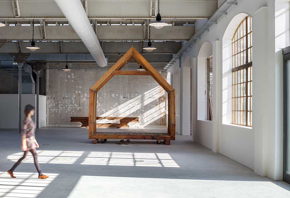Bygningen har et areal på 2000 m² med arbeidsplasser, utstillingsområder og verksteder i en bærekraftig renovert gammel hall.